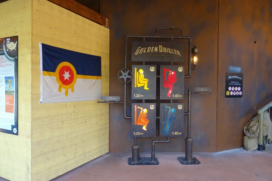Les nombreux bidons de pétroles que l’on trouve parsemés dans le décor de Golden Driller ont été récupérés chez un garagiste et ont été traités par les équipes du parc…
