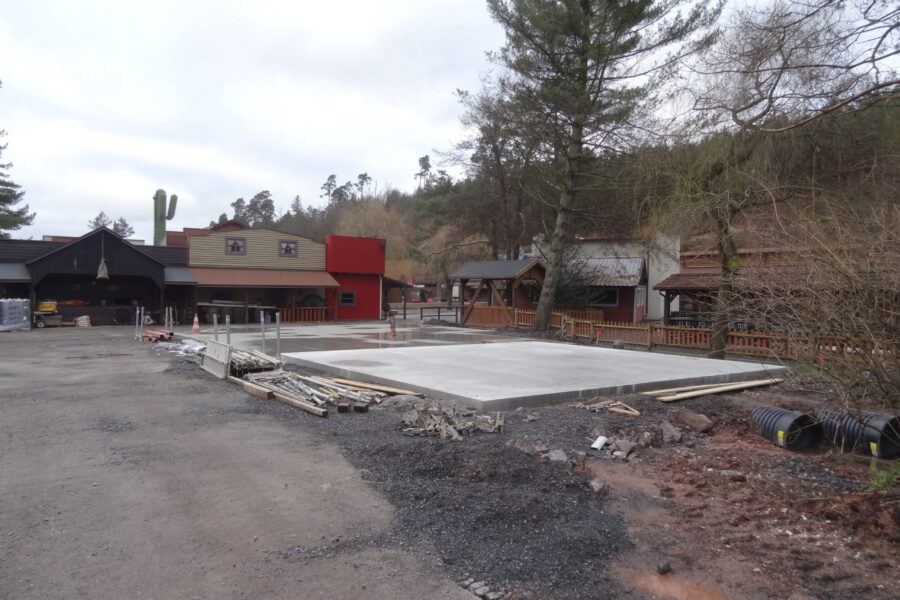 Cette photo a été prise le 5 février 2016, seulement 2 mois avant l’ouverture du parc. On y voit la dalle de la scène du Billy’s Show et des stands…