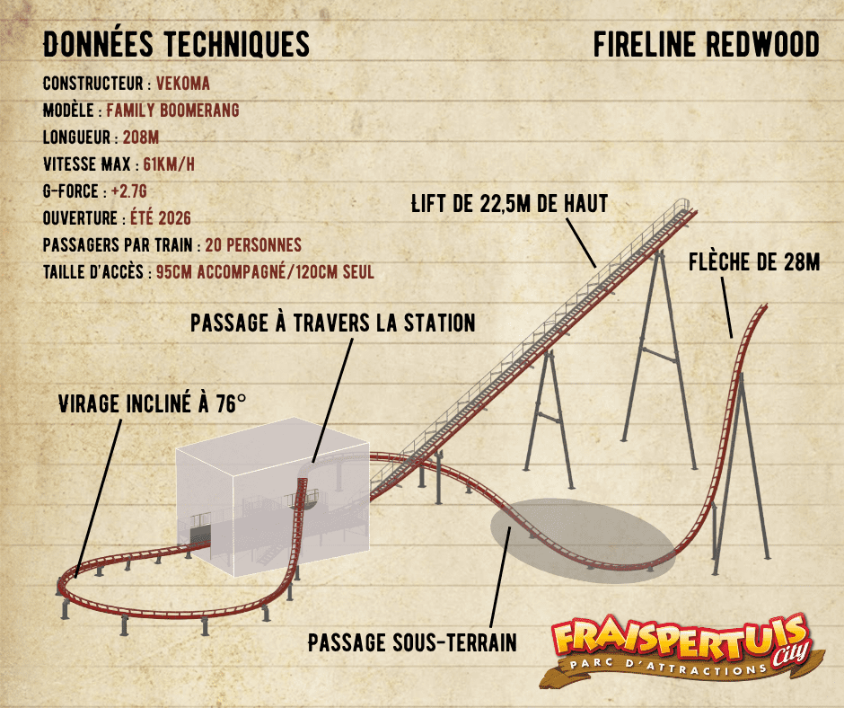 Vekoma nous a proposé un layout de Family Boomerang Custom adapté à notre place et était dans les capacités de nous le livrer pour 2026. Comme vous avez sans doute pu le voir sur les images drone que partage Clément du chantier, on voit clairement une fosse. Or, il n’y a aucun Family Boomerang qui descend aussi profond que celui-ci. Ils sont généralement tous au niveau zéro au niveau de l’altimétrie. Nous, on sera à -5m par rapport au sol et on espère que ça va rendre la sensation sympathique, sans la rendre inconfortable.