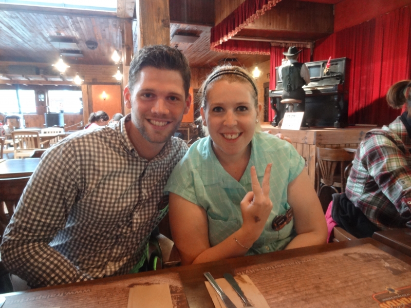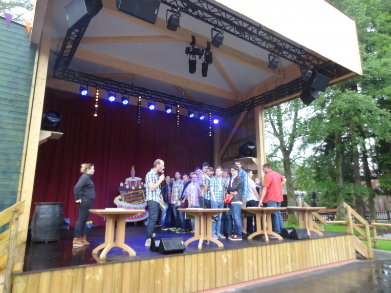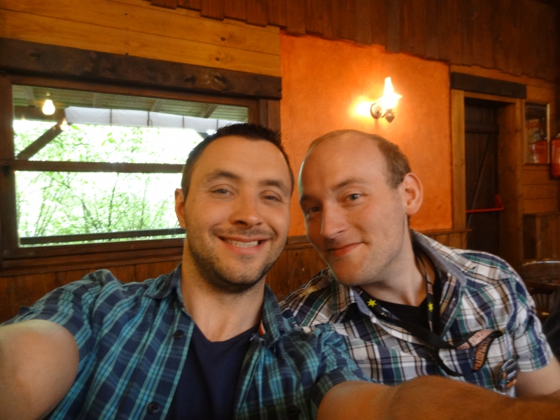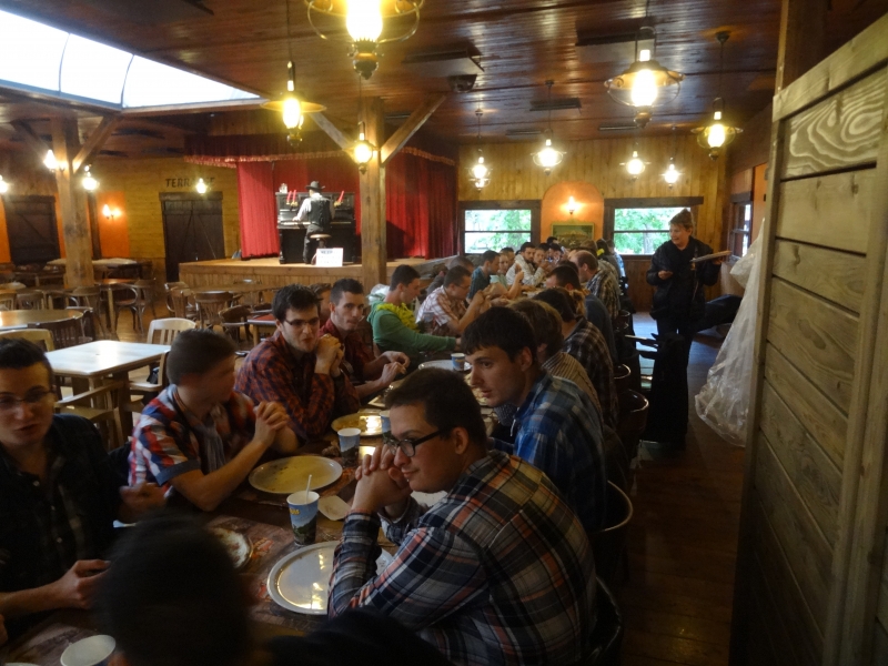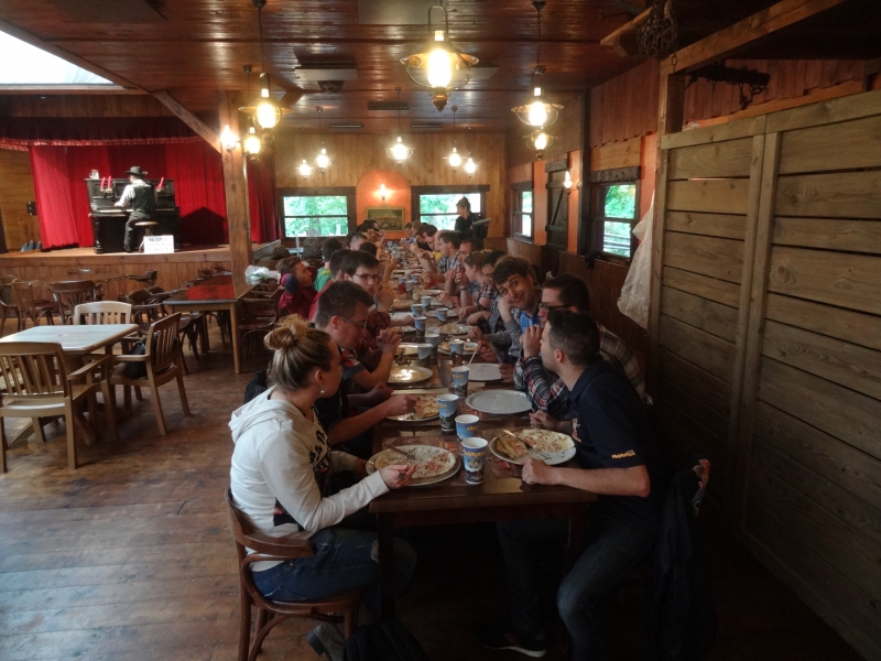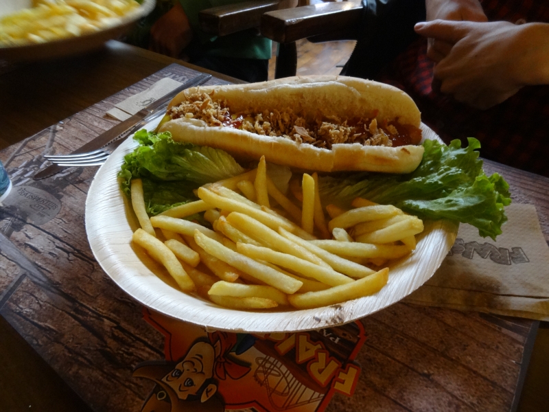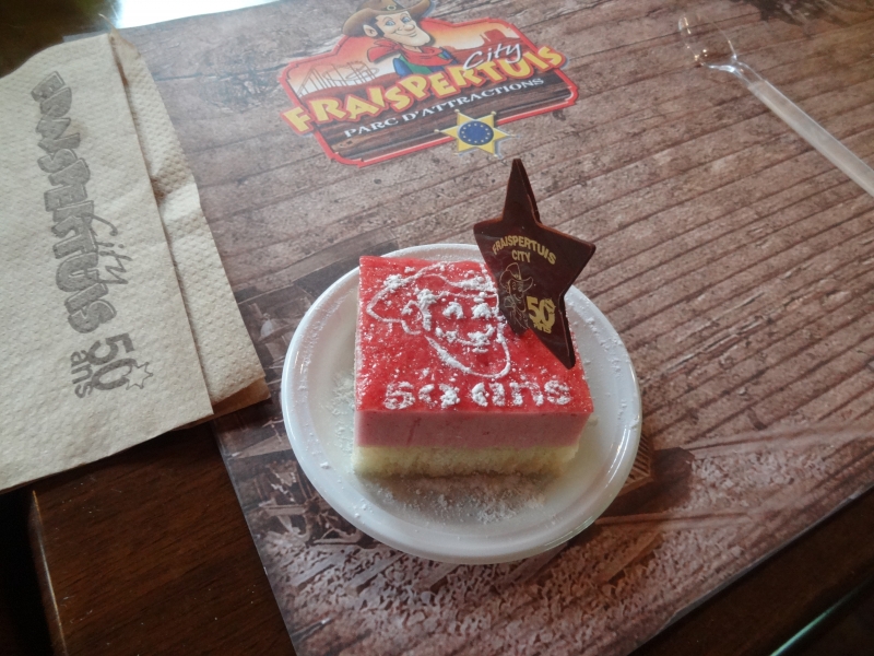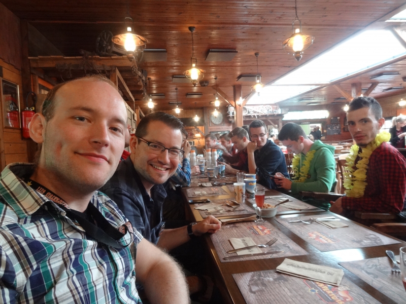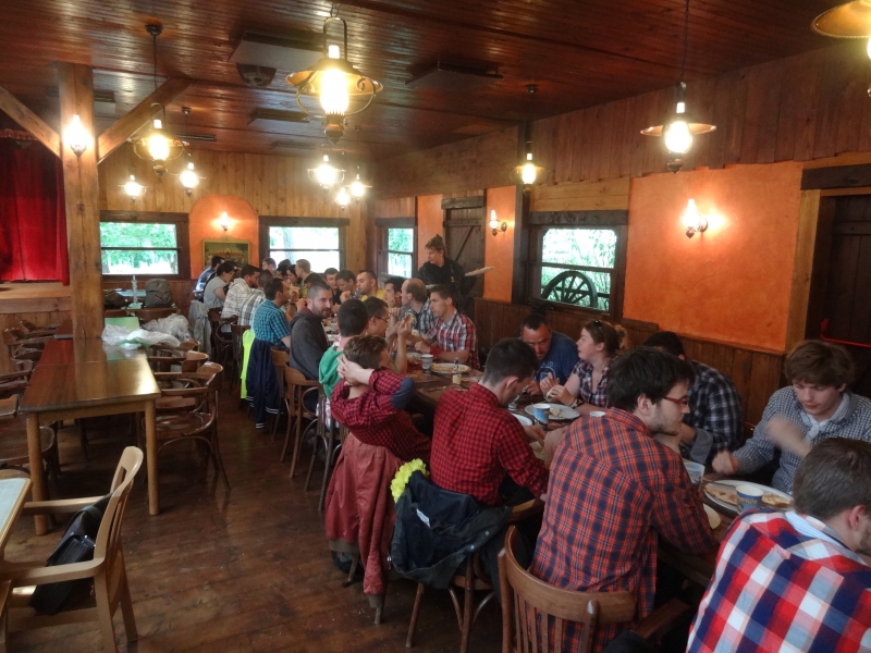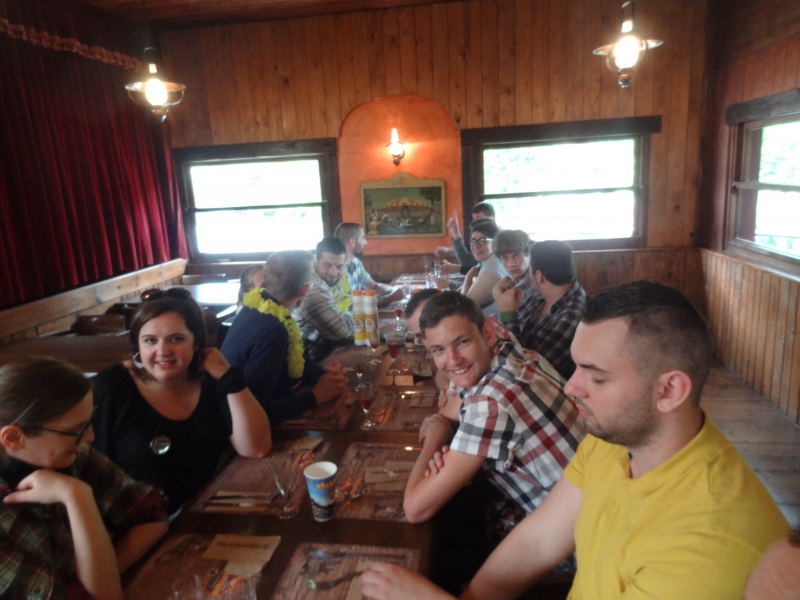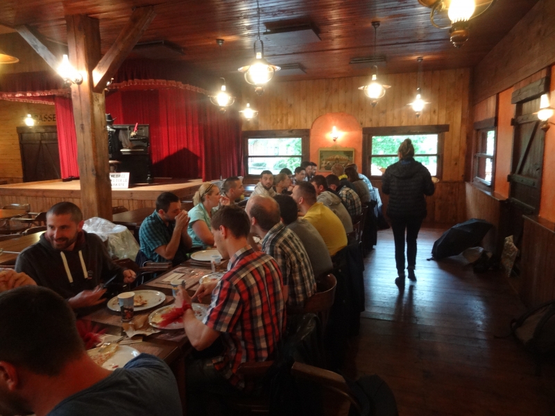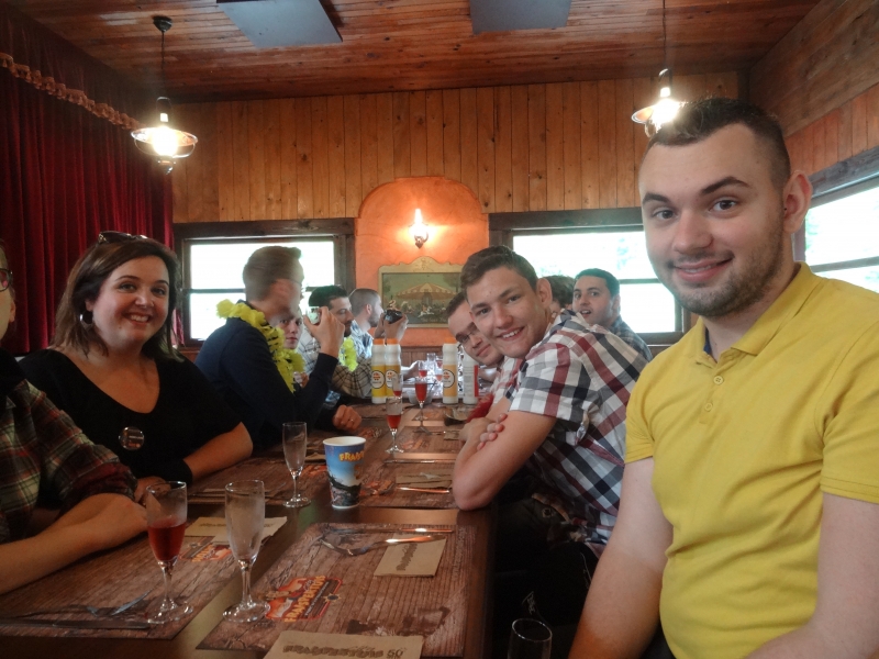 11h45 : À peine le temps d’un quartier libre et nous voilà déjà attendus au Saloon pour le repas de midi. Au menu cette année, tarte flambée et kir en entrée suivi de hot-dogs/frites et du gâteau anniversaire en dessert.