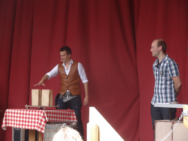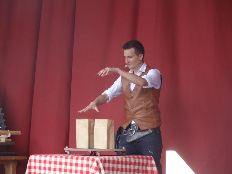 14h00 : C’est l’heure du spectacle « Coups de magie » présenté sur la scène du Billy Show par Lambert du décor. Il sera assisté pour un tour par Arnaud pour trouver la combinaison du coffre #canassondeconfort.
