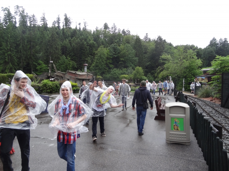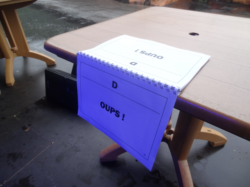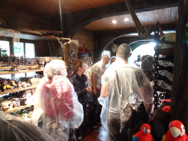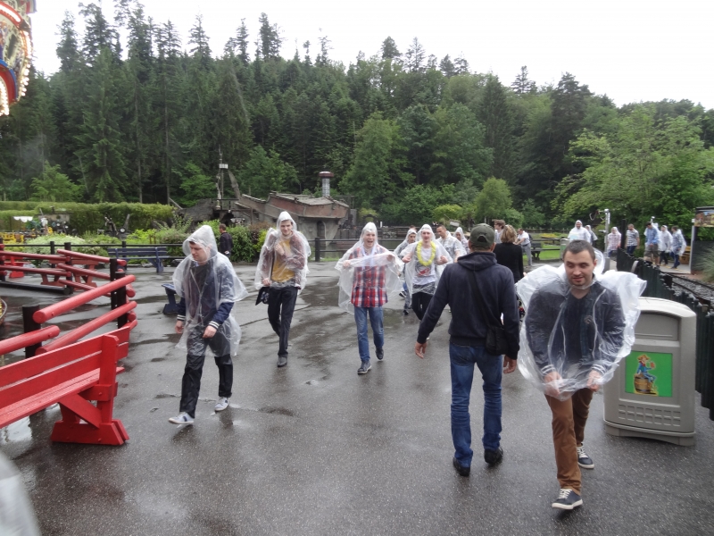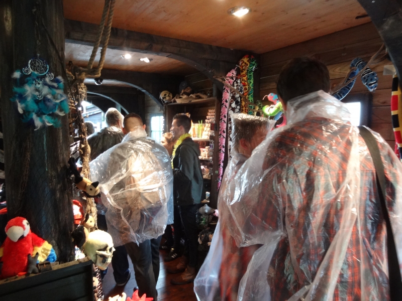 L’intermède pluie nous bloque dans la boutique un petit moment. Merci à Nadia d’avoir eu pitié de nous en nous offrant à tous des ponchos ! De quoi repartir pour un nouveau jeu tout en restant discret dans le parc. Nouveau dress code.