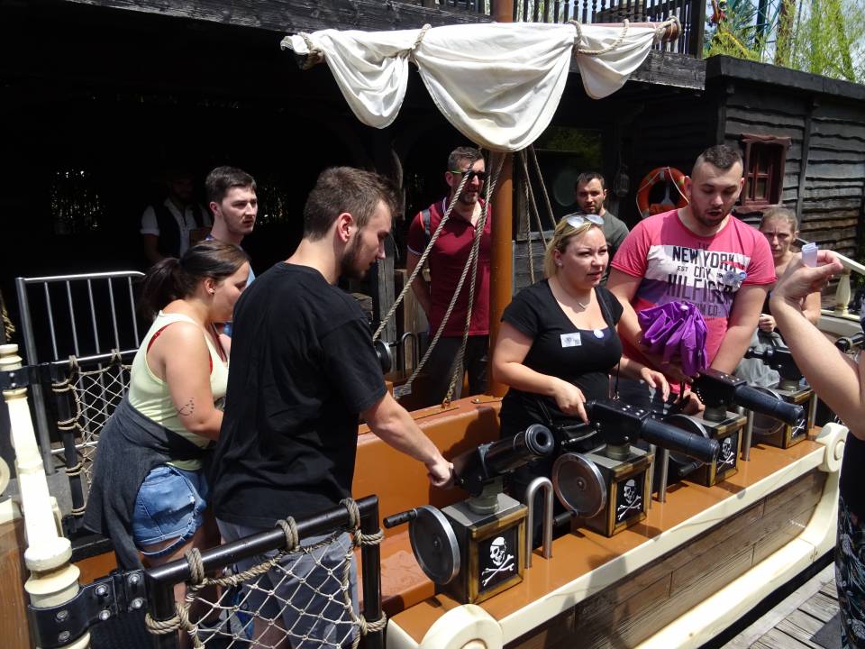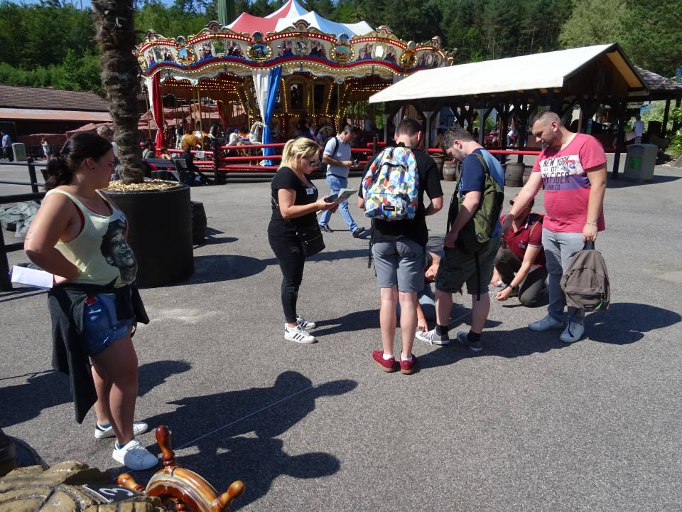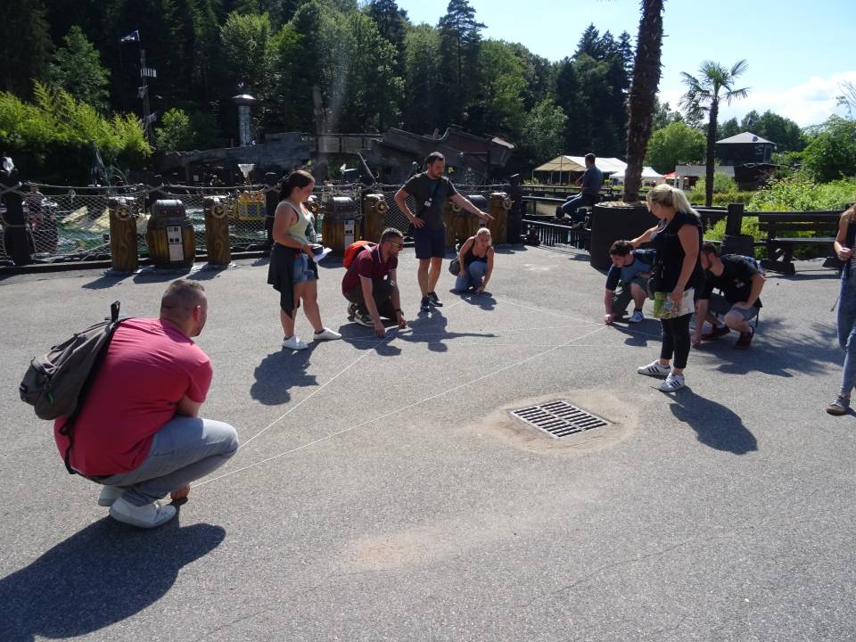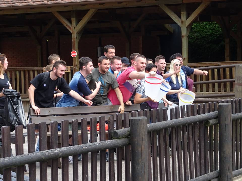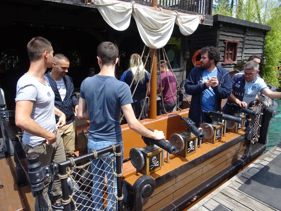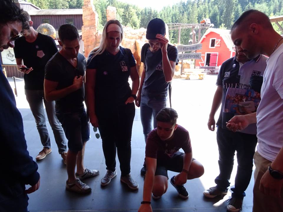 10h00 : le parc ouvre ses portes. Alors que les premiers visiteurs courent vers les attractions, on se dirige vers l’Arizona Pizza pour le petit déjeuner. On y retrouve Patrice Fleurent, le directeur du parc pour un petit mot d’accueil. C’est également le moment de la distribution des badges et de la création des équipes. Chacun tire au sort son badge qui lui indique le nom de son équipe.