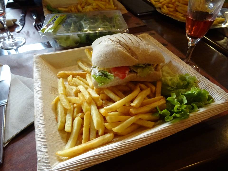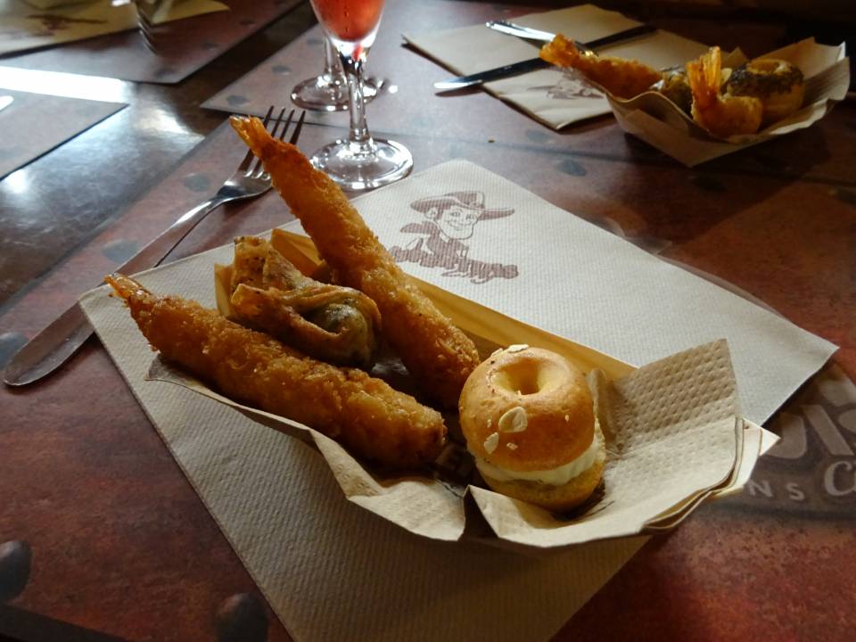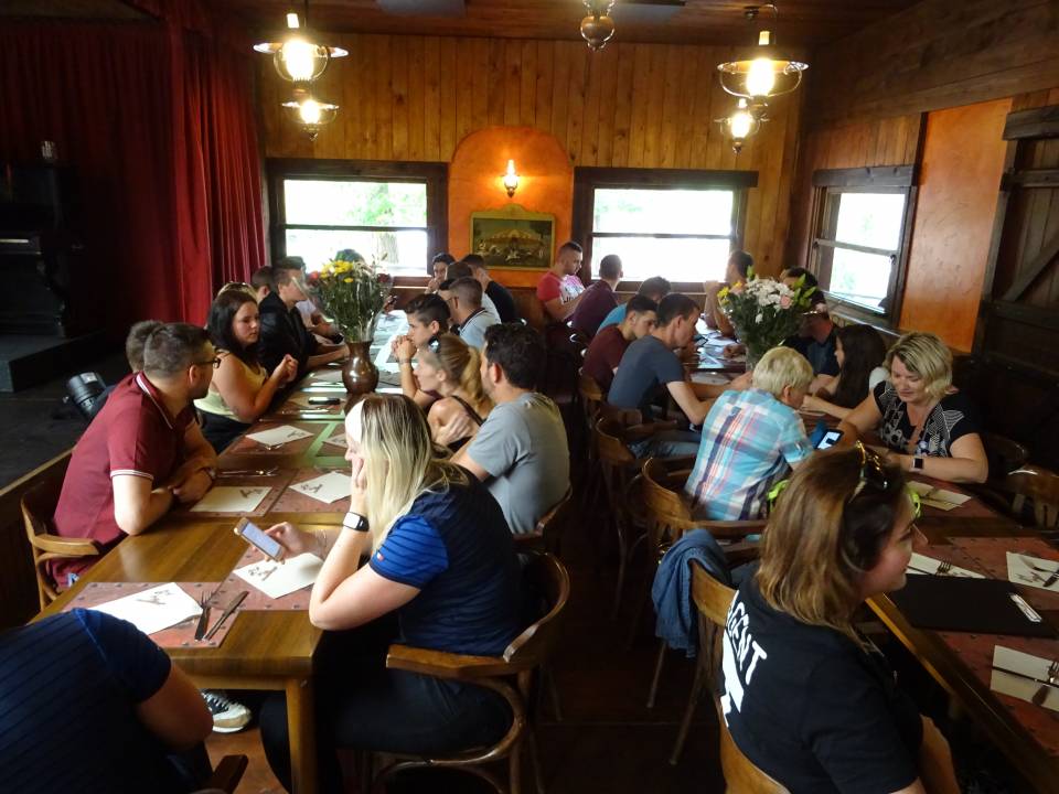 11h45 : après un court temps libre pour profiter des attractions, nous retrouvons tout le monde au Saloon pour le repas. La tablée s’agrandit d’année en année. Le parc nous avait préparé cette année une entrée type tapas et en plat, le Billy Burger. En ce jour de match de la coupe du Monde, les plus supporters ont pu suivre le score grâce à l’écran géant qui avait été installé sur la scène.