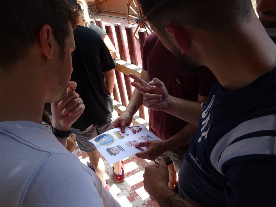 À bord d’un bateau de Pirate Attack, ils se sont vu remettre une enveloppe contenant 7 feuilles codées. Chaque code permettait d’obtenir un mot indice de 1 point. Tous ces mots indice ont un mot en commun. Il y avait 3 points bonus à gagner pour l’équipe qui trouvait ce mot commun.