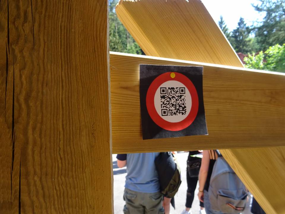 Toutes les équipes repartirent vers l’emplacement de ces gommettes à la recherche d’indices. En cherchant bien, ils découvrirent des QR code aux couleurs de leur enveloppe et correspondant aux gommettes de leur plan. En scannant ces QR code, ils obtenaient des flèches soit vers le haut, soit vers le bas.