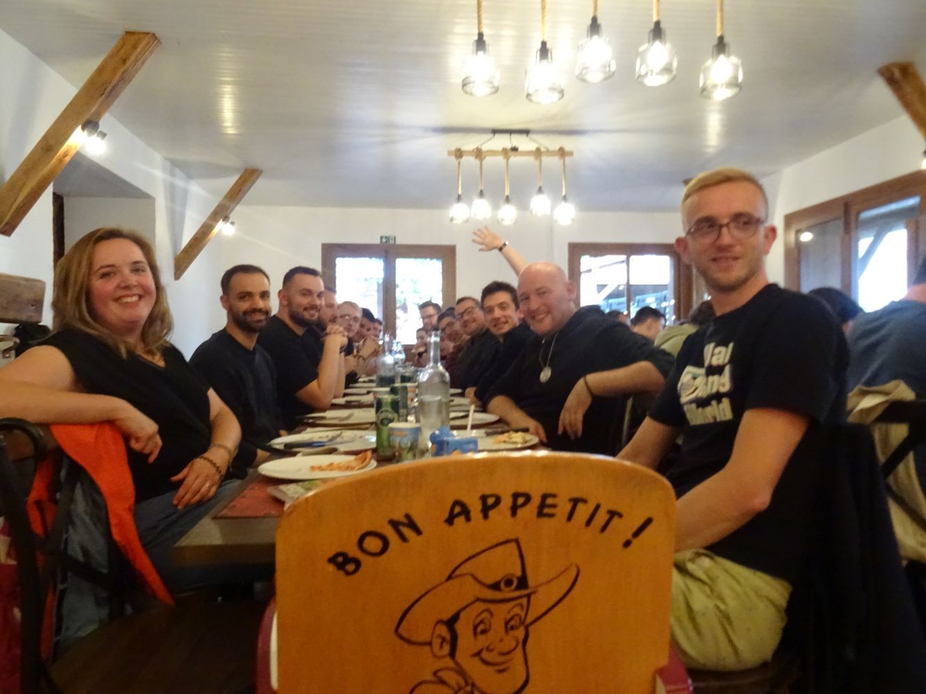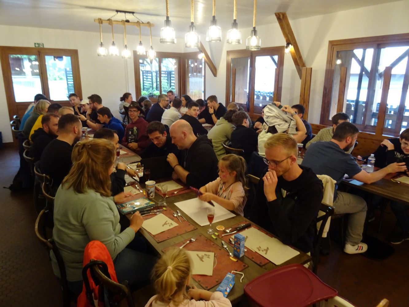 Après ce premier jeu et un temps libre, les équipes se retrouvent pour le repas autour de deux grandes tablées préparées pour nous au Saloon. Au menu Sandwichs du bucherons et sandwichs végétariens.
