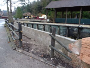 Pour améliorer la sécurité des abords du Flum, de nouveaux murets de parpaings ont été montés tout autour du parcours pour éviter que quelqu’un ne voit l’eau de trop près. Cela n’est jamais arrivé, mais mieux vaut prévenir que guérir. Ces murets seront d’ailleurs projetés de béton sculpté pour les intégrer au mieux dans le paysage.