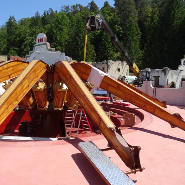 Ce type d’attraction est connu pour produire un bruit important. 14 vérins de ce calibre, ça ne passe pas inaperçu. Le parc et Technical Park ont travaillé sur ce point avec l’ajout de silencieux. Le compresseur principal a été délocalisé jusque sous la montagne pour éviter le bruit trop important à proximité de l’attraction et un petit local technique isolé enferme encore un peu de bruit. Celui-ci se cache derrière les petites portes en bois entre l’attraction et l’allée devant la Tornade. Encore une fois, des détails techniques bien pensés pour faire la part belle à l’attraction et au fun.