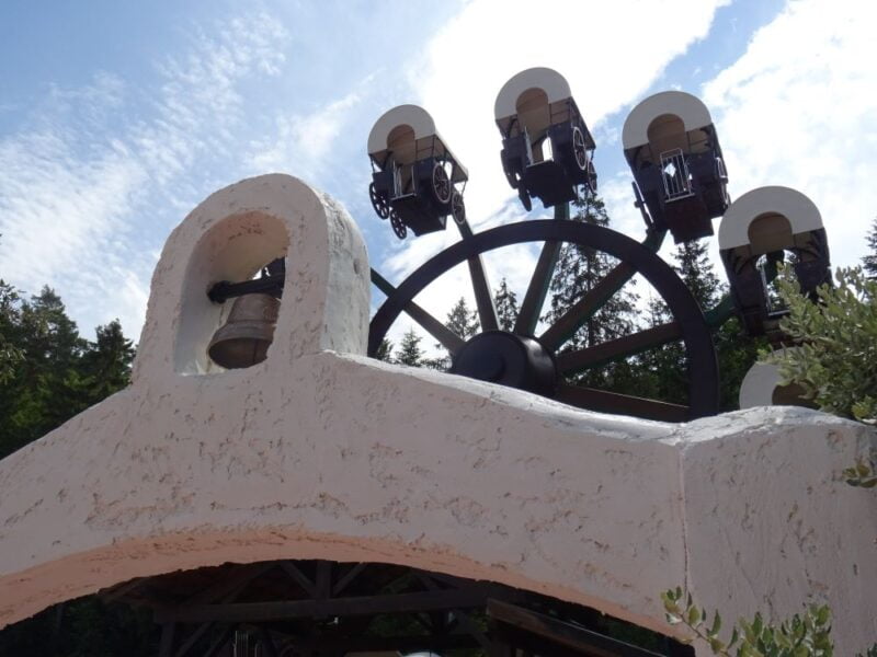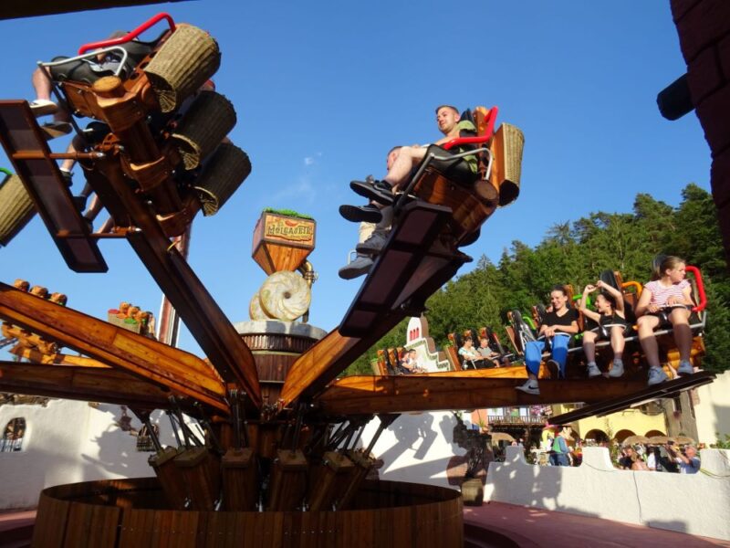La file d’attente passe sous une pergola bien agréable pour se protéger du soleil tout en profitant du paysage. Les visiteurs s’avancent ensuite dans le bâtiment qui abrite la reconstitution d’un moulin constitués de deux véritables meules de pierre, que le parc avait mis de côté depuis des années, sans savoir s’ils allaient s’en servir un jour. Le reste de la structure en bois a été complètement réalisée par les menuisiers du parc, sur les plans du directeur, inspiré par de vieux plans de véritables moulins. Cette structure si lourde et imposante a été intégrée dans le bâtiment pendant sa construction, avant que le plafond n’ai été fait.