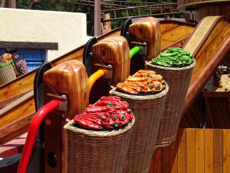 Un détail technique a permis au thème de l’attraction de prendre une justification ingénieuse lorsque les premières infos sur les forces et les tailles d’accès ont été annoncés au parc en février 2023. Les forces ressenties entre les trois sièges de chaque bras sont vraiment différentes (plus d’1g de variation) et la place à l’extrémité a été annoncée comme interdites aux moins de 1,30m. Il fallait trouver un moyen visuel pour faire comprendre cela et que les places de l’extrémité soient facilement identifiables par rapport à cette donnée. Les piments et leur puissance gustative étaient parfaitement adaptés pour cela. Comme sur l’échelle de Scoville, les piments sont répertoriés par rapport à leur puissance. Leur couleur n’est en réalité pas un indice efficace pour déterminer leur force, mais dans l’imaginaire collectif, les couleurs vertes, oranges et rouges signifient bien une augmentation du danger. Voilà pourquoi on trouve à présent des paniers de piments à l’arrière de chaque sièges, dont la couleur est déterminée par le positionnement.
