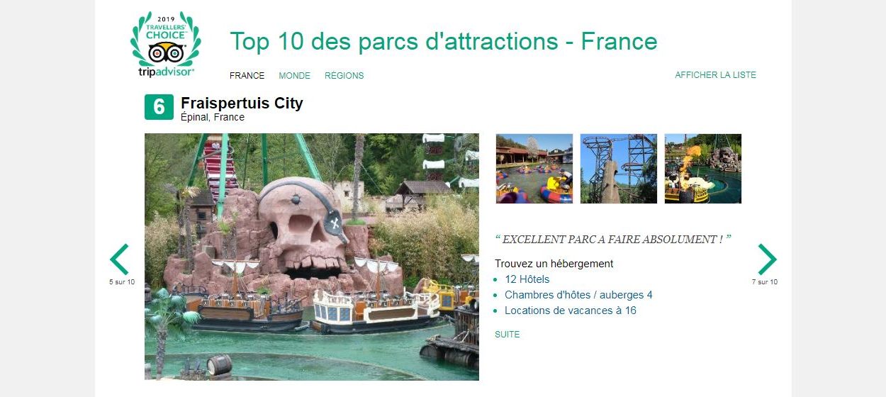 Chaque année, TripAdvisor publie un classement des meilleurs parcs de loisirs par pays, par continents et au niveau mondial. Basé sur les avis et notes de millions de voyageurs, cette année, Fraispertuis City décroche la sixième place du classement français et obtient même la 21ème place du classement européen.