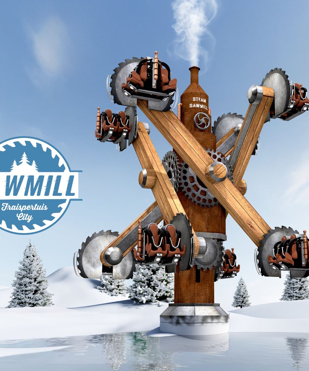 Avec ses imposants bras rotatifs et ses sièges en mouvement perpétuel, cette nouvelle installation recrée l’effervescence d’une scierie à vapeur hors norme, emportant les visiteurs dans les rouages d’une machine géante à plus de 10m du sol. L’attraction a une capacité de 32 personnes (8 x 4 sièges). L’attraction sera accessible à partir de 1m accompagné et 1,20 en autonomie. Elle devrait comme sur El Molcajete être équipée d’une file single rider.