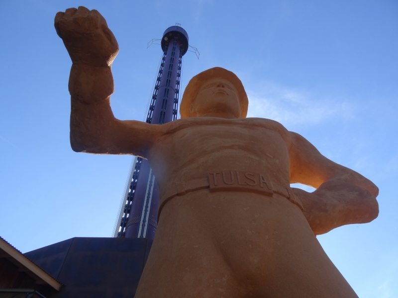 Golden Driller est en place, il attend encore son derrick sous son bras et sa teinte définitive.