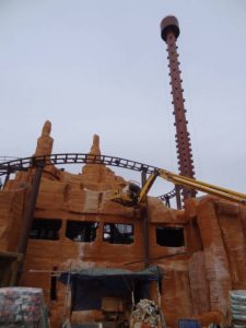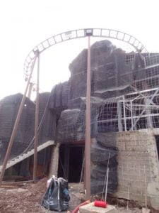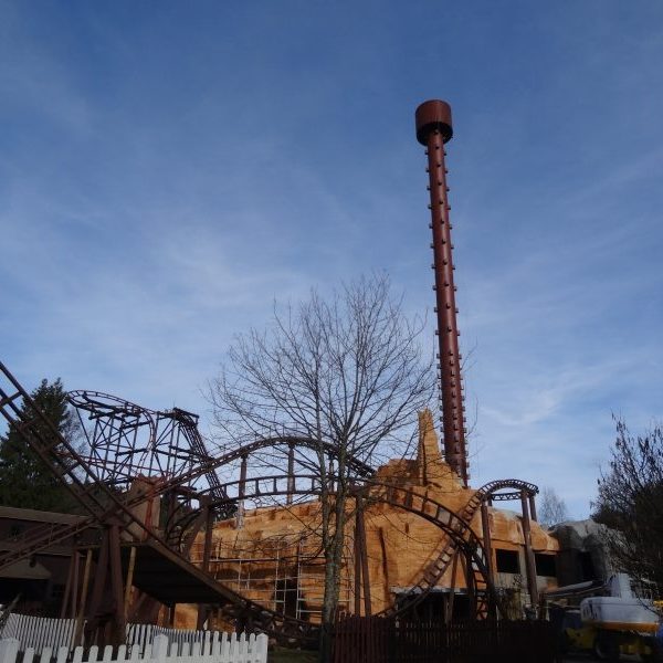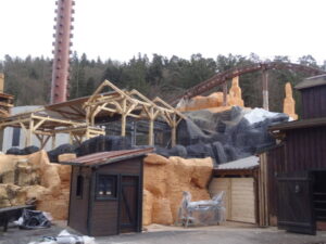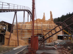 La montagne prend forme et sous les coups de truelles des sculpteurs on en oublie de plus en plus la structure en dessous et le fait que tout soit en béton. La façade Sud, voisine du Lucky Burger est de plus en plus impressionnante. Les baraques en bois prévues ne devraient plus tarder à venir s’y mêler. Côté Golden Driller, c’est là où il reste encore le plus de travail mais il se fera de paire avec la création de la file d’attente, mise en forme avec la construction d’un bâtiment qui permettra par la même occasion la mise à l’abris de la zone de freins du Grand Canyon.