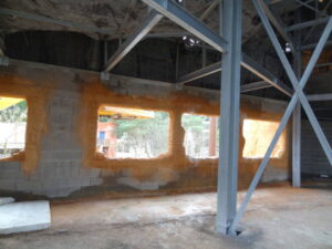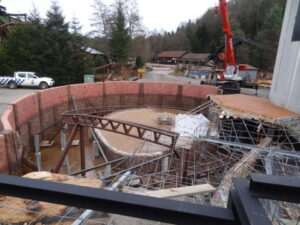 Pour terminer, une petite photo de la boucle du Grand Canyon et de l’escalier en cours de réalisation pour le début de la file d’attente du rocher. Dans le fond de la fosse, on aperçoit les supports qui permettront de mettre sur une grande partie un plancher (inspiré de la première maquette d’AAB) qui cachera en grande partie les fondations du Grand Canyon. Le reste sera recouvert de roche pour en finir avec cette dalle pas très esthétique et naturelle.