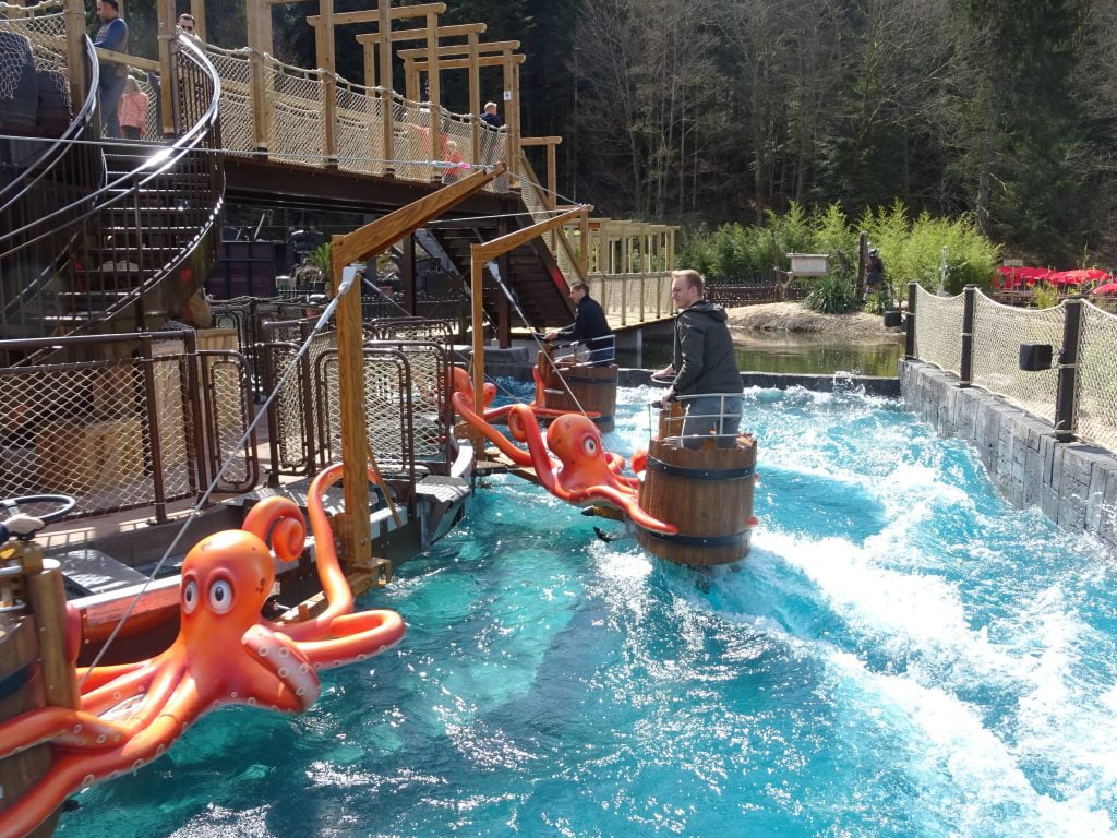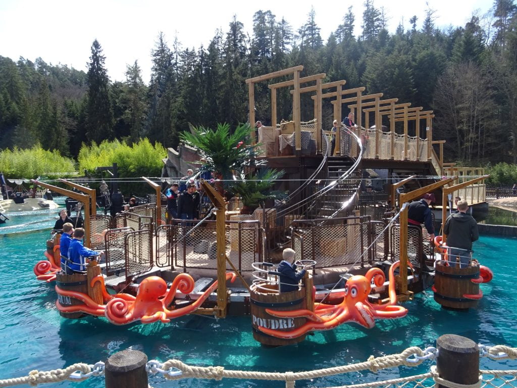 Comme on peut le voir, la passerelle et les escaliers sont en place. La toiture de la passerelle n’est pas terminée et l’ensemble devrait encore avoir un coup de peinture, mais pour ce qui est de l’attraction, elle tourne et semble être très appréciée des visiteurs. Les effets de vagues sont magnifiques et dont très agréables au bruit.