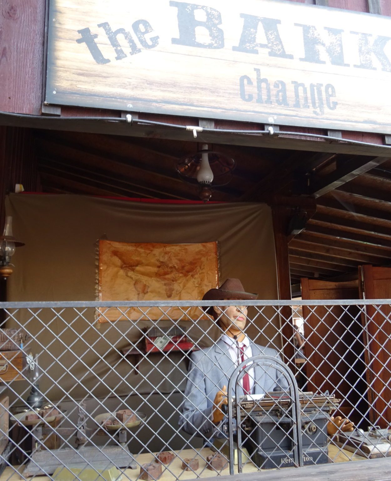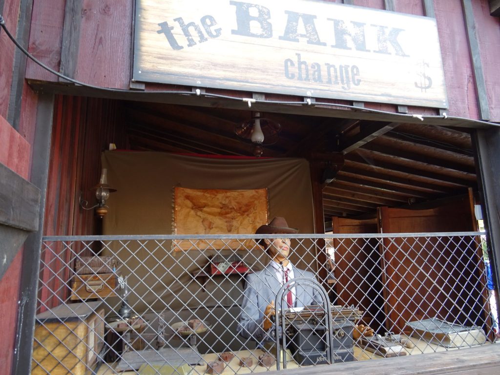 Qui se rappelle du petit guichet à la sortie du Grand Canyon ? Il représentait la banque de Fraispertuis-City. Là où les chercheurs d’or, après avoir terminé leur course folle dans les wagonnets du train de la mine ou ceux qui ont tamisés suffisamment de pépites, peuvent venir faire estimer leur récolte et l’échanger contre quelques billets verts.