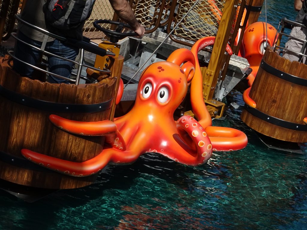 L’île aux pieuvres est une attraction de type Jet-ski du constructeur Zierer. Quand Fraispertuis City a choisi ce type d’attraction, il demanda au constructeur la fabrication de gondoles personnalisées en formes de pieuvres et de tonneaux pour s’intégrer à la Crique des pirates. L’attraction qui existe sous différentes formes à travers le monde a donc ici un design inédit.