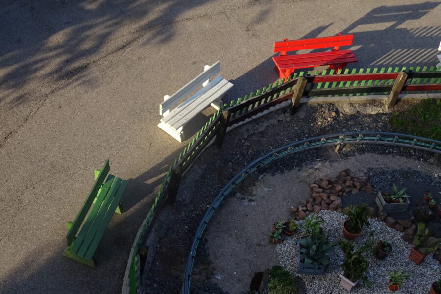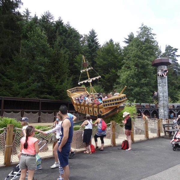 Certains éléments de la décoration de Golden Driller visibles dans sa file d’attente viennent directement du chantier de construction de l’attraction comme les tourets qui ont permis le transport des câbles. ![]()