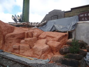 Les différents morceaux du coasters sont dans les ateliers du parc. La section de la gare a été montée pour préparer les modifications de structures.