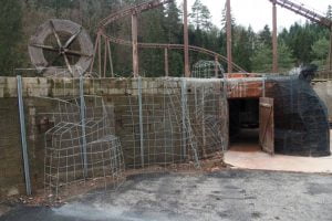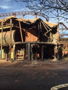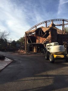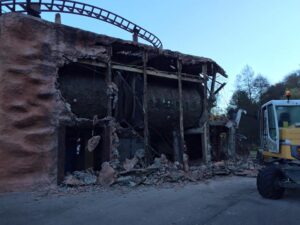 La démolition du rocher a nécessité le démontage complet de la mine d’or qui ferme pour la seconde fois dans l’histoire du parc. Quand le destin s’acharne !