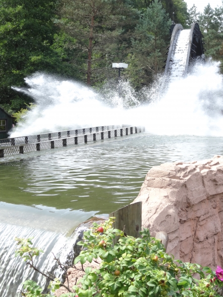 Dans sa chute, la bûche forme une énorme vague. Celle-ci varie en fonction du poids de la bûche et de sa répartition. Une zone Splash juste en face de la rivière Castor bénéficie de cette vague et permet de profiter de l’eau sans faire l’attraction.