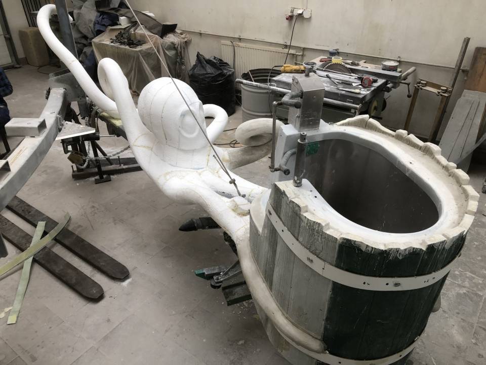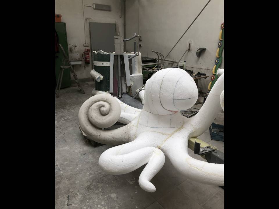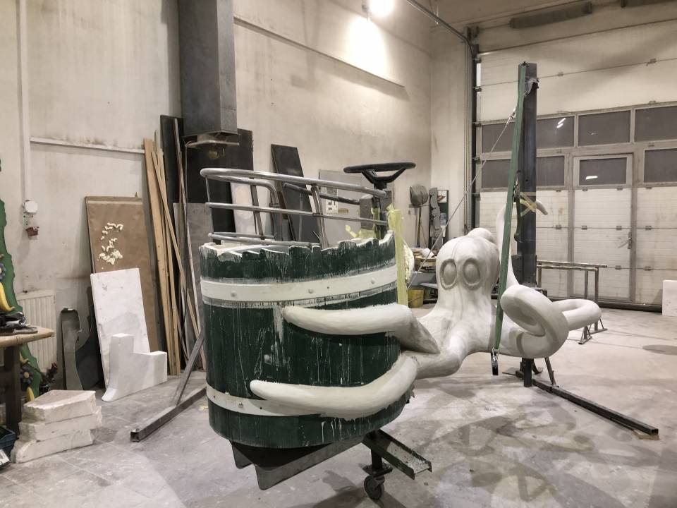 Pour s’accorder à la thématique pirate, un design de gondole avec des pieuvres a été dessiné par le parc et sculpté spécialement par Zierer pour Fraispertuis City.