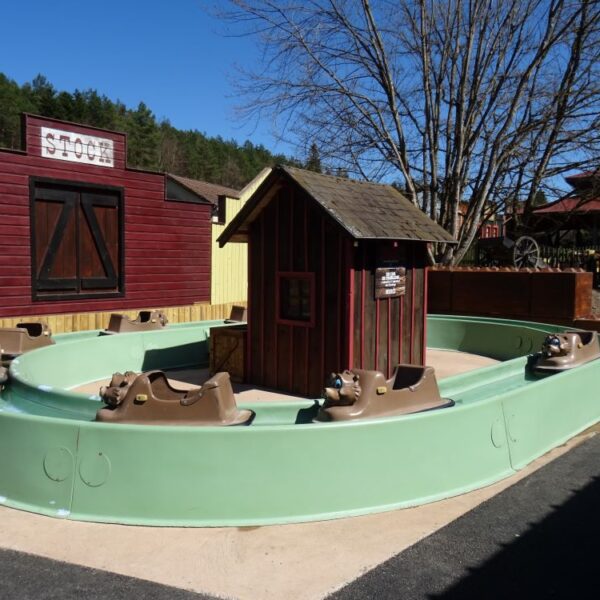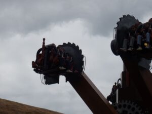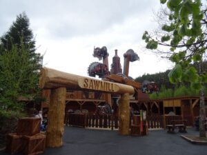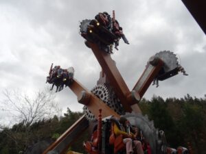 Une fois passée l’arche réalisée dans un véritable sapin des abords du parc et sculpté à la tronçonneuse par un artiste jurassien, on entame la file qui longe le bâtiment de la menuiserie du parc (la vraie). Pendant toute la file on garde une belle vue sur l’attraction tout en étant abrité de la pluie. Le mouvement de l’attraction est très impressionnant de l’extérieur et le fun est très présent à l’intérieur.