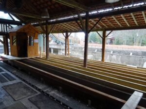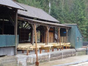 Ce qui saute aux yeux en premier lieu, c’est que le bâtiment de la gare du Flum a été refermé sur sa pointe pour finir le bâtiment tout en le laissant aéré comme auparavant. Au niveau de la file d’attente également, les poutres principales ont été remises en place et attendent le retour d’un plancher et des barrières pour être à nouveau praticable.