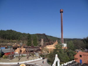 Le chantier continue malgré l’ouverture du parc. La zone de chantier entre le Blizzard et Golden Driller est complètement fermée au public pour des raisons de sécurité. Si les nacelles ne sont pas encore arrivées, ce sont les « catchers » (les grapins) qui sont en train d’être mis en place. Le travail d’AAB est terminé sur le rocher mais il manque encore de nombreux détails en bois pour finaliser l’ensemble.
